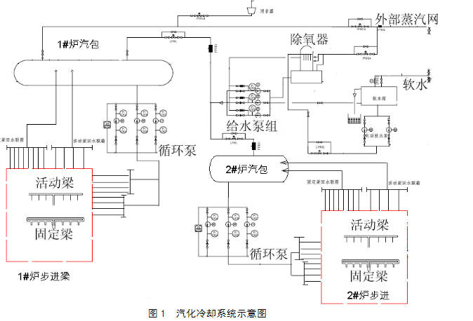 加熱爐汽化冷卻系統(tǒng)用于爐內(nèi)步進梁冷卻,防止步進梁高溫下變形、損壞,同時將冷卻水變成蒸汽部分分離出去。過程是:軟水進入除氧器進行除氧后(將軟水中氧進一步減少)由給水泵注入汽包,汽包中的軟水由循環(huán)泵打入步進梁內(nèi),一部分軟水變成蒸汽后以飽和蒸汽的形式收集,輸送至外部使用,另一部分軟水或蒸汽繼續(xù)參與步進梁冷卻。